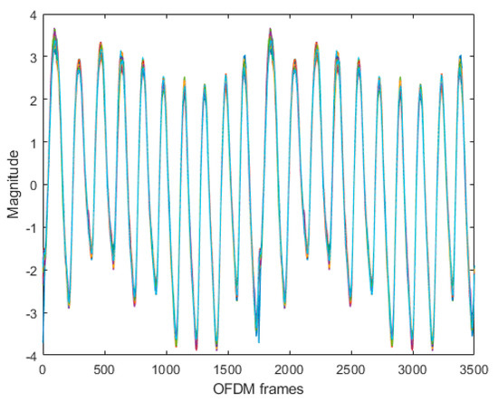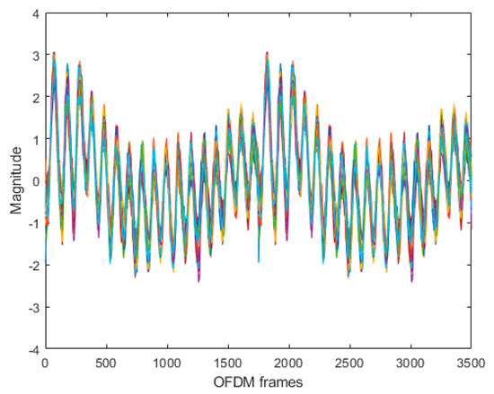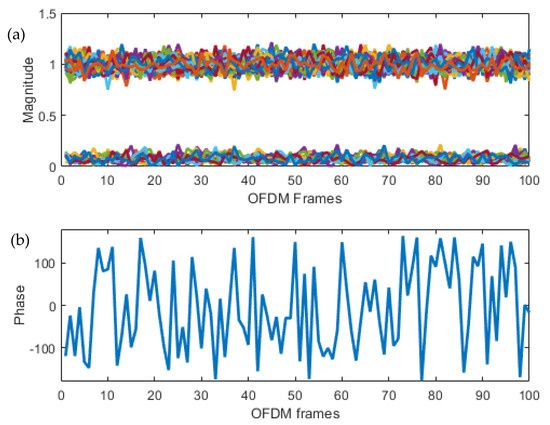 where , the cyclic prefix (CP) in the time domain is inserted at the start of the frame by replicating the last one-fourth samples, rendering the frame . The CP addition in the OFDM frame is used for avoiding inter-symbol interference (ISI). The complete OFDM frame, including the CP, can be written mathematically as provided in Equation (3).