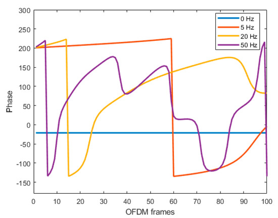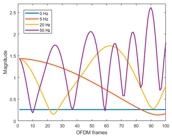 In the fading channel, the Doppler shift is added at the simulated channel to the transmitted OFDM frame . The received signal is provided in Equation (8).