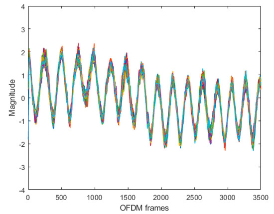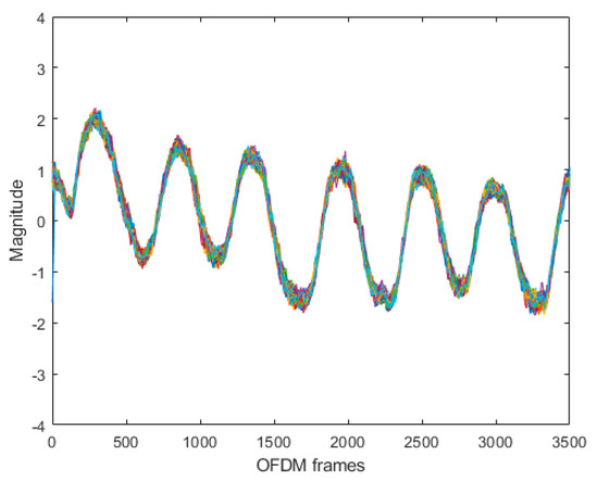 In all the simulated channels, frame synchronization is not applied to analyze the CFR and CP is directly removed. While in the real-time software design of the receiver, CP is removed after the synchronization. The software-defined flexible USRP hardware configuration block is used to modify and control hardware parameters, such as carrier operating frequency, system gain, decimation, master clock rate, etc. The received signal, , possesses the WCSI which includes channel noise, reflection from human body motion, and carrier frequency and time offset, etc. The offset in carrier frequency between the transmitter and receiver oscillator mismatch destroys the orthogonality among the subcarriers and introduces ICI. Therefore, compensation and estimation of carrier frequency offset (CFO) are required at the receiver. The CFO compensation can be performed either in the time domain before the FFT or by directly adjusting the carrier frequency oscillator. Mathematically, the CFO is used as a multiplication of each sample by , where is the normalized CFO and N is the number of subcarriers. The received samples can now be modelled as shown in Equation (12):