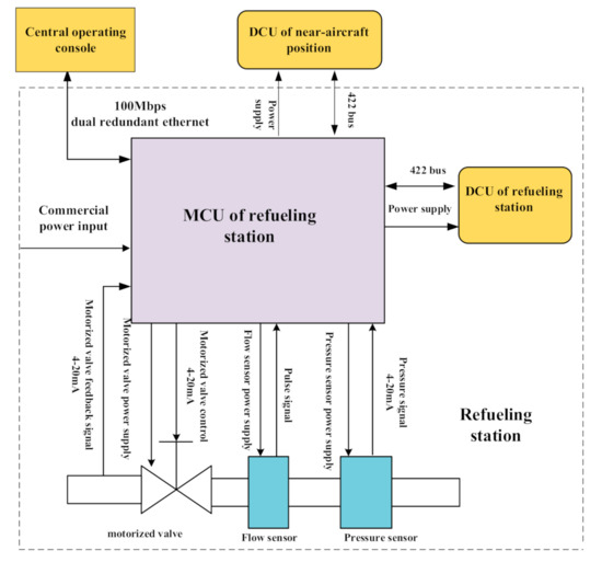 The system can achieve the closed-loop control of the refueling input flow rate, the automatic control of the set refueling volume, and the collection and alarm of environmental parameters such as pipeline pressure according to the refueling model. Moreover, the system can dynamically display the refueling process information in real-time on three terminals. Figure 1 shows the overall plan. Since the equipment works in an inflammable and explosive environment with refueling refueling, the MCU of refueling is designed as explosion-proof equipment, and the DCU is intrinsically safe. The two ways of communication are designed separately. The 485 communication form of intrinsic safety and explosion-proof conversion is used to connect for control and display. The system consists of five parts: the MCU for refueling, the DCP of the near-aircraft, the control unit of the refueling station, the centralized display control console, and the on-site sensors. The main function of the refueling MCU is to control the corresponding flow rate according to the type of refueling equipment (such as the model). The system can realize the automatic control of the preset refueling volume, the oil outlet pipeline pressure collection, alarm, and valve closing linkage control. Moreover, the system can provide the power required by various peripherals. The refueling station DCU and the centralized console can be set and displayed: refueling model, refueling amount, and system parameters; the near-aircraft DCU can display system information and simple start–stop function input buttons without setting functions. The priority of the control parameters set by the DCU of the local refueling station is higher than that of the centralized console, and the local refueling DCU can release the priority to the centralized console by pressing a button. The refueling station DCU and the near-aircraft DCU communicate with the MCU through 422 bus. The centralized control center communicates with the MCU through dual redundant Ethernet. The MCU of refueling is the core part of the system.