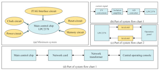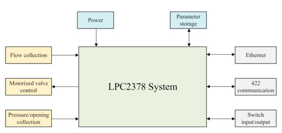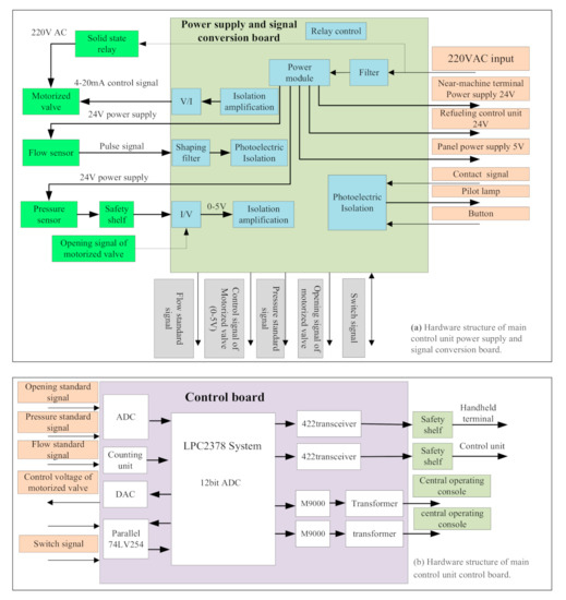 The MCU adopts LPC2378 based on the ARM core, which has a powerful communication function and industrial control ability. The hardware composition of the MCU is shown in Figure 2. The internal circuit of the refueling MCU consists of two main circuit boards: the former mainly completes the power supply of each module and sensor of the system and standardizes the external input and output signals; the other carries on the standard signal sampling, processing, and output, as shown in Figure 3.