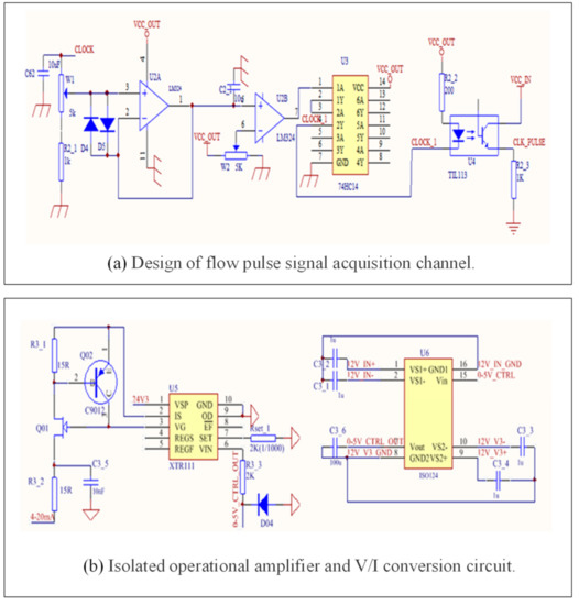 The external counting unit on the MCU chip LPC2378 is used to collect the flow sensor signal. The output information of the flow sensor is as follows: the amplitude is 0–10 V, the duty cycle is 50%, and the frequency is 0–850 HZ pulse signal. The circuit of the flow collection preprocessing section is shown in Figure 5a.