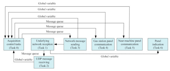 - Task 4, an information exchange with the DCU of refueling station mutual, including sending information and receiving setting instructions. The queue buffer receives control information from Task 0 and sets control instructions for Task 0 through global variables.