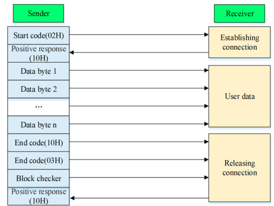 The MCU needs to communicate with two display control terminals, and the physical layer uses 485 communication. The transceiver between the MCU and the display control of the refueling station or between the MCU and the near-computer display control uses two independent channels to form a full duplex and uses 3964(R) protocol. The data-link layer uses a 3964 protocol to ensure the reliability of communication. The MCU characters of the 3964 protocol are shown in Table 1. The communication process of the 3964(R) protocol is shown in Figure 7.