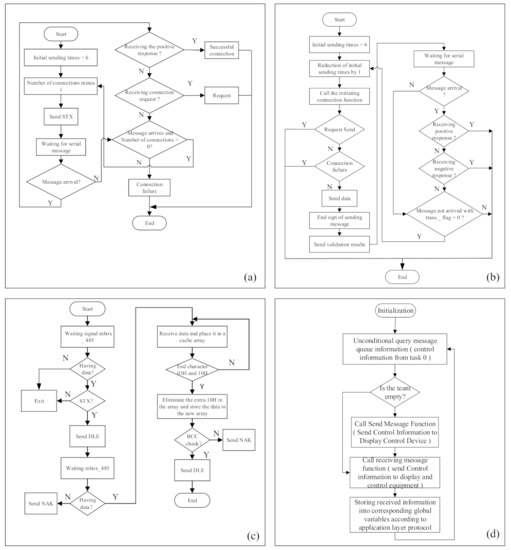 Flowchart of task execution: (a) initiating connection flowchart, (b) partial flowchart of sending message function, (c) partial flowchart of receiving message function, and (d) flowchart of Tasks 4 and 5.