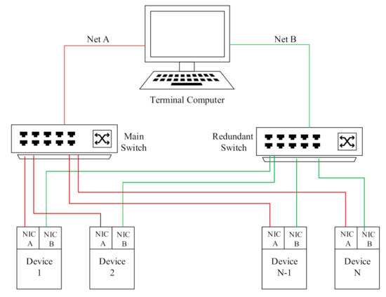 The dual-redundant NIC is an important part of the system. The NIC in the network is composed of two mirrored NICs on the hardware. Each NIC has the same IP MAC address and supports all functions of the ordinary NIC. Simultaneously, only one channel is working, and the other channel is in a redundant state. The dual-redundant channel switching is realized in the dual-redundant NIC device driver. For the network layer and above, the dual-redundant channel switching is completely transparent, which improves the flexibility and reliability of the module. The network topology of dual-redundant networks is shown in Figure 9.
