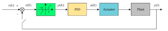 The measurement range of the flow sensor is 0–1000 L/min, and the actual flow peak is 850 L/min. The PID controller with the dead zone for velocity control is shown in Figure 10.