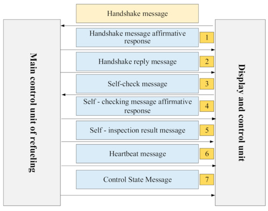 The communication process between the MCU and the DCU or near-machine unit of the refueling station is shown in Figure 11. The DCU sends the handshake message to contact the MCU after the equipment is powered actively. Then, the DCU sends the self-check message after the MCU responds. After the connection is established, the self-check result of the MCU is sent to the equipment to show the self-check state of the equipment in two DCUs.