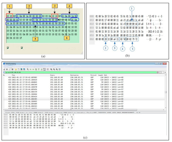 System grab packet: (a) send and reply message for 3964(R) protocol, (b) the specific content of the UDP message, and (c) use the packet capture software to obtain the UDP packet.