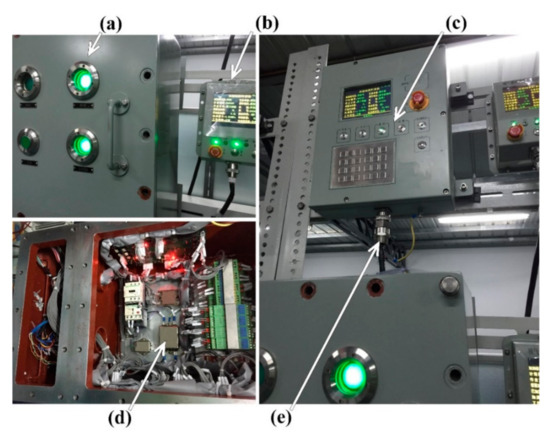 Refueling control system equipment: (a) MCU of the refueling system, (b) DCU of the near-machine, (c) DCU of the refueling system, (d) inside of the MCU, and (e) RS485 communication interface.