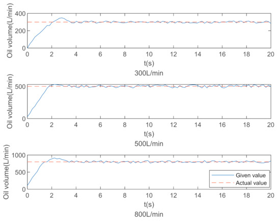 The final result of this study is that each functional module of the refueling system works normally; the control system can refuel according to the actual flow after receiving the control message sent by the control end. From Figure 14, in different given values, the refueling control system can control the refueling volume to fluctuate around a given value. Table 2 shows that the switching time of this system is fast, which can realize the system stabilization.