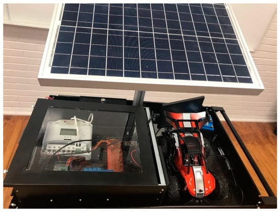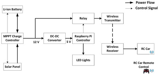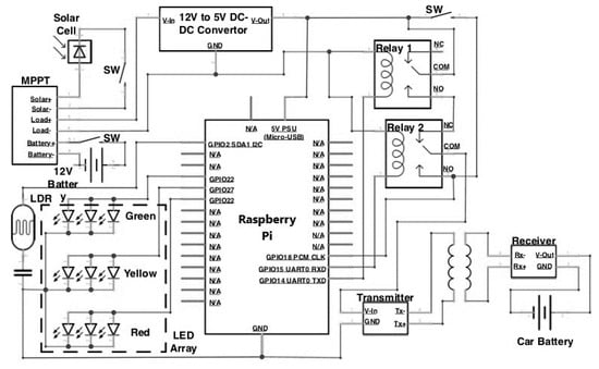 The MPPT charge controller is connected to the load to power various components. The load consists of a 12 V to 5 V DC-DC convertor, a Raspberry Pi microcontroller, a four-relay module, a series of nine LEDs (a 3 × 3 grid with each row controlled individually), a light dependent resistive (LDR) circuit, and a wireless transmitter/receiver to charge an electric toy car to represent electric vehicles for proof of the concept. The system also includes other smaller components, such as physical switches and terminals to support the desired functionality. Schematics and a picture of the solar microgrid are shown in
