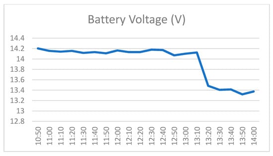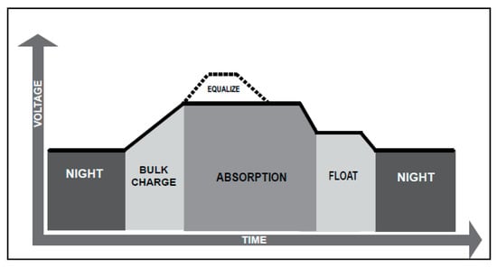 Figure 9. It can be observed that after the battery was fully charged after 13:00, the charge controller reduced the battery voltage to the float voltage setpoint, where a very low rate of maintenance charge was provided.