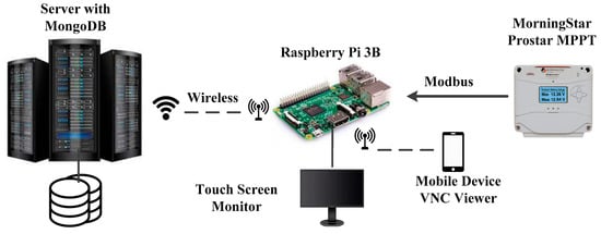 Figure 5. The MPPT charge controller is the central data sampling device that generates the electrical data about the system components including the solar panel, battery, and the loads. The sampled data were retrieved by the Raspberry Pi microcontroller and Modbus communications via a USB Meterbus adapter. Then the data were filtered and formatted to proper values on the Raspberry Pi and sent via WiFi to the cloud MongoDB. The Raspberry Pi was also connected to a touchscreen LCD monitor that provides a graphical user interface (GUI) to energize or de-energize the loads. Control to the loads on a mobile device from remote locations was realized through a Virtual Network Computing (VNC) Viewer connected to the Raspberry Pi.