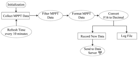 Figure 6. After initialization of the system environment, such as network IP addresses, port numbers, and other global variables, a data process loop with refreshing interval of 10 min is set by default. The refreshing interval is configurable. The first step in the loop is to collect MPPT data and keep the data in an array. Then the data are filtered, formatted, and converted from float 16 to decimal numbers. Finally, the data are packaged to JavaScript Object Notation (JSON) and sent wirelessly to the cloud MongoDB data server so that the data can be used for research, analysis, and visualization.