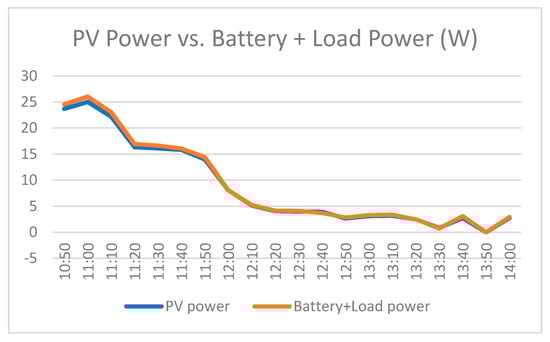 The voltage for the photovoltaic (PV) and loads remained relatively constant over time. PV current was highest initially to charge the battery. As the state of charge of the battery increased, the MPPT charge controller reduced the output current from the PV to avoid overcharging the battery. From 10:50 am to noon, there was a large current flowing into the battery. After that, the battery current was rapidly reduced and went to almost zero at 13:00. At 13:20, 13:30, and 13:50, the battery current became negative, which means the battery was being discharged to provide power to the loads. Overall, since the solar irradiation was very good on the day of testing, the solar panel was able to provide sufficient power to the loads and charge the rechargeable battery. When the battery was fully charged after noon, solar power was curtailed by the MPPT charge controller.