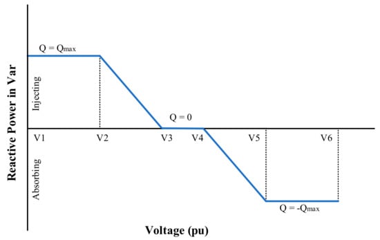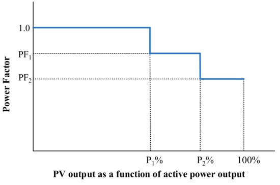 The power factor is adjusted as a function of the active power output of the PV inverter [23]. Since the active power output is proportional to the PCC voltage, the absorption of reactive power could be introduced during high solar power generation. A generic control function, such as that shown in Figure 3, could be utilized to regulate the grid voltage.