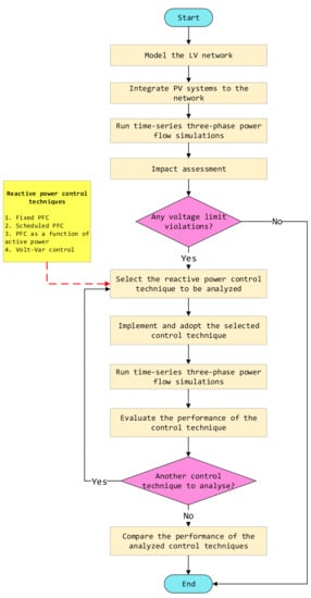 The complete flowchart of the research method is shown in Figure 5. First, a detailed network model for the selected LV distribution network was developed in the Open Distribution System Simulation (OpenDSS) software. Then, three-phase time-series power-flow simulations were performed to investigate the potential overvoltage issues with high PV penetration. Following the detection of voltage rise issues, each of the above-mentioned reactive power control techniques of the PV inverters was implemented and adopted to ensure the statutory voltage limits of the LV distribution grid. The performance of the adopted control techniques was evaluated and quantified using the three performance metrics discussed above. Finally, a comparative analysis was carried out to compare the performance of the studied reactive power controls.