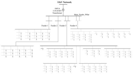 In order to evaluate the effectiveness of the studied reactive power control techniques in mitigating voltage rise due to high PV penetration, a typical Malaysian LV distribution network was modeled by using the OpenDSS software interfaced with MATLABTM. The single-line diagram of the test network is shown in Figure 6. The network comprised four feeders connected to a 1 MVA, 11/0.433 kV distribution transformer that supplied 124 customers via a three-phase connection. The peak demand of the network was presumed to be 620 kW, with a peak load of 5 kW per customer. Figure 7 demonstrates the one-minute normalized residential load profile and PV generation profiles under sunny and normal climatic conditions, which were used to conduct a high-resolution analysis.