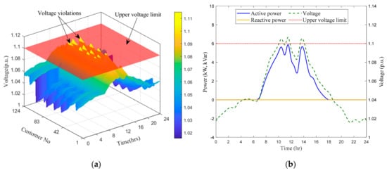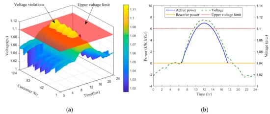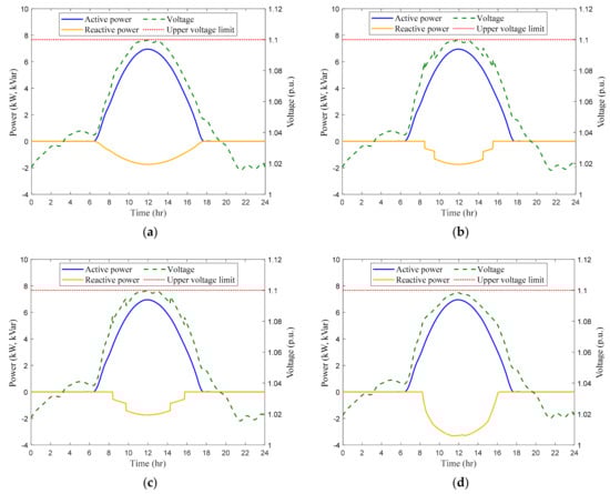 Figure 8a shows the daily voltage profiles of all 124 customers in the LV network for the sunny climatic condition with no reactive power control. As expected, a significant number of customers (66) were recorded as having upper voltage limit (1.1 p.u.) violations due to the high solar PV penetration. According to the simulation results, the maximum recorded voltage was reported at the 107th node of the network, which was also the furthest node from the distribution transformer. The daily variations of the terminal voltage and the active and reactive power output of the PV inverter connected to the critical node (i.e., the 107th node) are shown in Figure 8b.