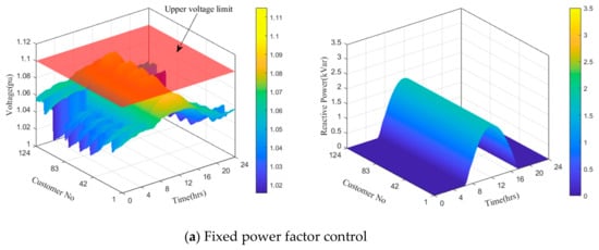 The daily variations of the voltages of all 124 customer nodes and the reactive power compensation of the PV inverter connected to the critical node for the fixed PFC, scheduled PFC, PFC as a function of injected active power, and Volt-Var control are shown in Figure 10.