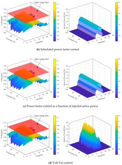 Similarly, the daily variations of the voltage of all customer nodes, as well as the terminal voltage and active and reactive power output of the PV inverter connected to the critical node, are presented in Figure 9. As per the simulation results, 34 consumers were recorded as having upper voltage limit violations.