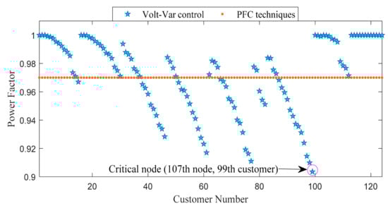 As listed in the table, in the studied PFC techniques, the power factor limit of the inverter varied at a defined value, and the minimum power factor value assigned to these controls was 0.97. However, in the Volt-Var control, a wider power factor range (1.00 to 0.90) is required compared to those required by the other controls. Figure 12 presents the variations of the power factors of PV systems connected to each customer during peak PV generation with the PFC and Volt-Var controls. As can be seen in Figure 12, in the Volt-Var control, the power factor value decreased from unity in each branch as the customer was pushed further from the starting point of the branch.