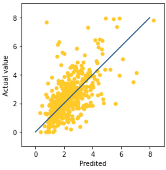 Secondly, we created a two-dimensional scatterplot for the observed values and predicted values generated by the trained attention-based LSTM using the 10-testing data. Figure 5 shows that the state-based LSTM model has a large difference between the measured and predicted values for the overall testing farms data.