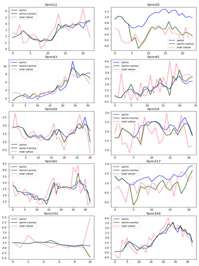 Figure 7 shows that the results of predicting tomato production for 10 randomly selected farms. In Figure 7, the blue solid line shows the result of predicting the production volume using the input attention-based RNN (IARNN), and the green solid line shows the output prediction result using the method combining the input attention-based LSTM and the ARMA model (IARNN + ARMA). The red line shows the actual production. As shown in Figure 7, if we analyze it graphically, the trend of almost all farms’ tomato production can be predicted well. In particular, farmers No. 54 and No. 317 showed good predictions even when there were large fluctuations in tomato production per week.