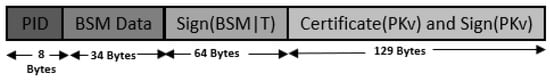 Before broadcasting a BSM, the sending vehicle v computes the digital signature of the message using its private key . This digital signature and the certificate of the vehicle () must be transmitted with each BSM. To validate the sender, the receiving vehicle first extracts from the certificate using the public key of the trusted CA (). Then, is used to verify the digital signature of the message. If verified successfully, then the sender of the message is authenticated []. A typical packet format for sending BSMs is shown below in Figure 1, where T is a timestamp that is concatenated with the message ( contains the PID and other relevant vehicular data for v) to ensure freshness of data.