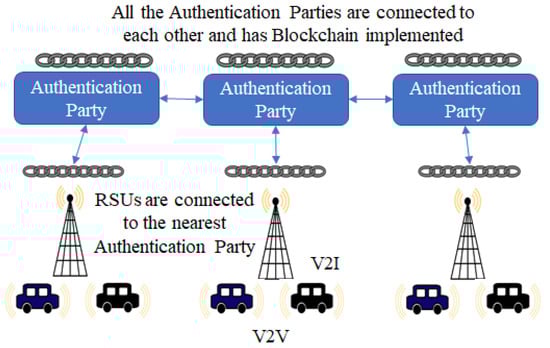 In this section, we discuss the architecture for our proposed blockchain-based pseudonym scheme. The V2V communication uses the DSRC/WAVE protocol stack [], with a three-tier VANET architecture, similar to that in []. The proposed approach would be suitable for use in conjunction with other architectures, such as ITS-5G as well []. As shown in Figure 2, there are three main classes of entities that participate in the authentication process. These are: (i) authentication parties (APs), (ii) roadside units (RSUs), and (iii) individual vehicles.