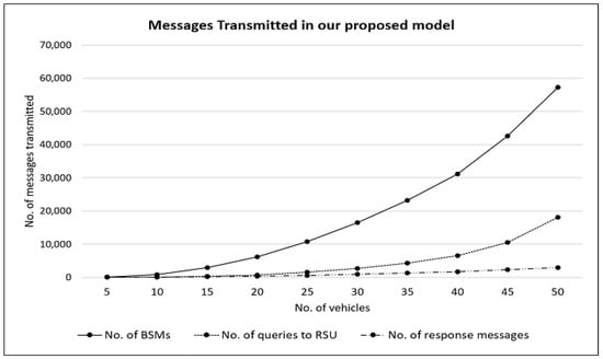 Figure 4 shows how the numbers of BSMs, RSU queries, and RSU response messages vary with the number of vehicles as the road traffic density increases. As expected, the number of BSMs increase steadily with the number of vehicles. However, the rate of increase for the number of RSU queries and RSU response messages is much lower. For PKI, there are no additional messages needed, if we assume that certificates are never revoked. However, this is not realistic and additional communication would be needed for PKI as well, for circulating the CRLs.