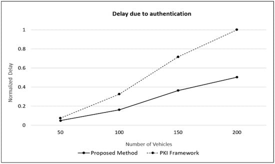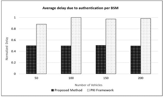 Figure 6 shows the total normalized authentication delay for all the BSMs. As expected, this delay increases as the number of vehicles (and hence the number of BSMs transmitted) in the simulation increases. We see that the proposed approach results in a significant reduction, about 47% on average, in the total delay.