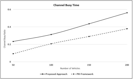 Finally, Figure 7 shows the channel busy time (CBT) for the two approaches. We see that for both cases, the CBT increases with the number of vehicles and PKI consistently shows a lower CBT. This is due to the additional messages, i.e., RSU queries and responses that are needed in the proposed approach.