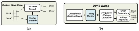 - Das, S.; Roberts, D.; Lee, S.; Pant, S.; Blaauw, D.; Austin, T.; Flautner, K.; Mudge, T. A self-tuning DVS processor using delay-error detection and correction. IEEE J. Solid-State Circuits 2006, 41, 792–804. [Google Scholar] [CrossRef]