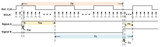 ADDLL generates multi-phase clock signals (MCLK), and its phase differences are equal and their sum equals Tref. TDA is the time interval between the positive edge of the first MCLK after the positive edge of Signal A and the first positive edge of reference clock after the positive edge of Signal A. TDB is the time interval between the positive edge of the first MCLK after the positive edge of Signal B and the first positive edge of reference clock after the positive edge of Signal B. TIA is the time interval between the positive edge of Signal A and the positive edge of the first MCLK after the positive edge of Signal A, and TIB is the time interval between the positive edge of Signal B and the positive edge of the first MCLK after the positive edge of Signal B. Since the time interval to be measured is not the same as the time interval measured by the counter stage, the part (TDA + TIA), not measured by the counter stage must be filled and the excesses (TDB + TIB) deducted. Thus, the time interval to be measured can be expressed as