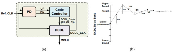 The ADDLL consists of a phase detector (PD), a code controller, and a DCDL, as shown in Figure 4a. PD receives two clock signals of the reference clock (Ref_CLK) and DCDL output (DCDL_CLK) and generates the input signal of the code controller (UP and DN) from the phase relationship between these two clock signals. The code controller adjusts the DCDL control code (DCDL_Code) from UP and DN and then changes the delay of DCDL by changing the DCDL control code. By aligning the positive edges of the Ref_CLK and DCDL_CLK, ADDLL is locked, meaning that the delay of DCDL equals Tref. The code controller uses binary search to control the code-locking process [16]. Figure 4b illustrates the binary search-locking procedure. First, the DCDL control code is set to an intermediate value. When UP or DN is at a high level, the DCDL control code increases or decreases by a specific amount of change. If the output of the PD changes from UP to DN or vice versa, the change of DCDL control code reduces to halve. Finally, when the change is reduced to one, the binary search process is completed, and ADDLL also completes the locking procedure.