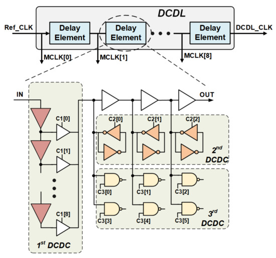 Figure 5 shows the circuit block diagram of DCDL containing nine DEs. Each proposed cascading-stage DE consists of three delay stages, namely, first, second, and the third digitally-controlled delay cell (DCDC). These three DCDC have different controllable delay range and resolution. The first has the widest controllable delay range, followed by the second and then the third DCDC. Conversely, the third has the finest controllable delay resolution, followed by the second and then the first. The overall controllable delay range and resolution of cascading-stage DE is a function of the first and third DCDC, respectively. Thus, the advantage of cascading-stage structure DE is that can provide a wide controllable delay range and fine controllable delay resolution.