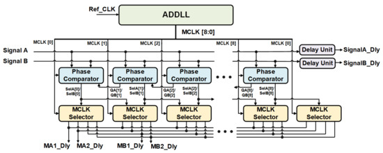 Figure 6 shows the circuit diagram of the complete ADDLL stage, including an ADDLL, nine phase comparators, ten MCLK selectors, and two delay units. The phase comparators provides the selection signals required by the MCLK comparator. From these selection signals (SelA[8:0] and SelB[8:0]), the MCLK selectors select two adjacent MCLKs on the positive edge of Signal A and Signal B, respectively. Through an appropriate delay, the delayed Signal A and B and their respective MCLKs (Signal A_Dly, MA1_Dly, and MA2_Dly) and (Signal B_Dly, MB1_Dly, and MB2_Dly) are sent to the interpolation stage for more accurate measurement.