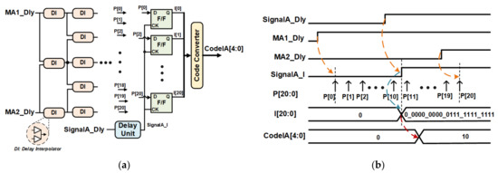 The interpolation stage mainly measures the time interval between selected MCLKs and Signal A/Signal B using multiple sampling signals between adjacent MCLKs to improve measurement accuracy. Delay interpolation makes the time interval between multiple sampling signals equal [16]. Figure 8a shows the circuit diagram of the interpolation circuit. There are two interpolation circuits in the interpolation stage, one for Signal A, the other for Signal B. Each interpolation circuit generates 21 sampling signals (P[20:0]) using delay interpolator, and then uses D flip-flops to generate the interpolation stage output. For example, if the positive edge of Signal A lies between P[10] and P[11], all bits of the outputs of D flip–flop I[10:0] are 1 and those of I[20:11] are 0. Finally, the code converter converts the outputs of a D flip–flop (I[20:0]) to the CodeIA[4:0] with binary format, as shown in Figure 8b.
