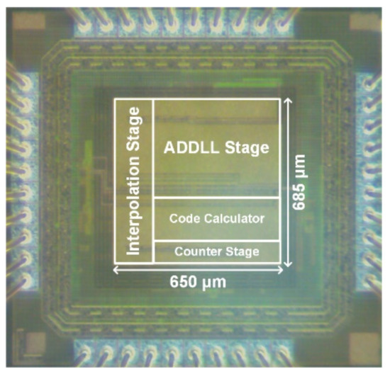 The proposed timing monitor is designed and implemented through the mixed-signal design flow, and fabricated by TSMC 0.18 µm 1P6M CMOS standard process with a core area of 685 µm × 650 µm. Figure 9 shows the microphotographs of the chip. The post-layout simulation results of the proposed timing monitor verify the relationship between the input time interval and output digital code. The range and resolution of the proposed timing monitor are 2.2 µs and 47 ps, respectively. The power consumption of the timing monitor is 7.58 mW when the reference clock signal frequency is 120 MHz and the operating voltage is 1.8 V.