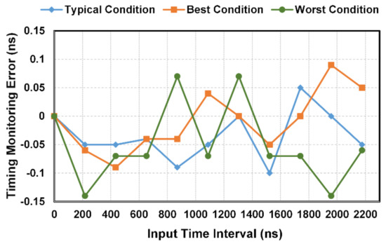To verify the impact on the output results under different PVT conditions, Figure 10 shows the timing measurement errors under three operation conditions. The process corner, supply voltage, and operating temperature of the best condition are Fast/Fast, 1.98 V, and −40 °C, respectively. Those for the typical condition are Typical/Typical, 1.8 V, and 25 °C, respectively and for the worst condition, we have Slow/Slow, 1.62 V, and 125 °C, respectively. The maximum monitoring error of the best, typical, and worst conditions is 0.02%, 0.02%, and 0.06%, respectively. Since there is the phase error between reference clock and DCDL output when ADDLL is locked, the monitoring resolution of the ADDLL stage is not equal to 1/M of Tref. Additionally, the outputs of interpolation stage may be not stable due to the charge and discharge current mismatching of interpolation circuit These errors cause the overall timing monitoring error is not the same with different input time interval.