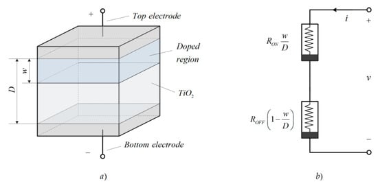 A schematic of the memristor nanostructure is shown in Figure 1a for explaining its operation and properties. This structure is related to memristors based on titanium dioxide and hafnium oxide materials. The electrodes of the element are made of metallic or other material with high conductance [15]. The structure of the memristor is based on a thin layer of amorphous titanium dioxide [4]. The equivalent circuit shown in Figure 1b corresponds to the state-dependent resistances of the doped and un-doped layers of the memristor element.