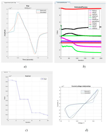 An example for the results obtained by the estimation of memristor model’s parameters using experimental current-voltage relationship is presented in Figure 2. This experiment is conducted in MATLAB and is based on altering the model’s parameters till obtaining a minimal error between the simulated and the experimental i-v relationships. The simulated and the experimental current–voltage relationships of a titanium-dioxide memristor after adjustment of the model A5 are shown in Figure 2a. The change of the model’s parameters during the estimation procedure is presented in Figure 2b. A diagram of the decreasing cost function shown in Figure 2c confirms the correct functioning of the estimation procedure. The corresponding experimental and simulated current–voltage relationships of the considered memristor element presented in Figure 2d are given for visual observation and comparison the results.