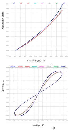 The frequently used standard titanium dioxide memristor models K1, K2, K3, and K4 and the corresponding modified models A1, A2, A3, and A4 are analyzed for sinusoidal voltage signal with an amplitude of 1.15 V and a frequency of 1 Hz. The derived state–flux relationships are presented in Figure 3a for comparison, the considered memristor models and confirmation of their proper behavior. The corresponding current–voltage characteristics derived in the LTSPICE environment are shown in Figure 3b. The respective characteristics have identical behavior. The increased nonlinearity of the dependence between the ionic dopant drift and the applied voltage leads to an increase in the memristor current for models A3 and A4. The behavior of models K5 and A5 is related to the Lehtonen–Laiho model, and it is identical to that of models A6, A7, and A8, which will be discussed in the next paragraph.