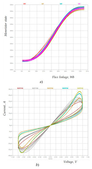 where Geq is the equivalent conductance of the memristor, G = 0.025 S is the maximal conductance of the element, xon = 0.06, σp = 4 · 10−5, A = 1 · 10−10 σoff = 0.013 B = 1 · 10−4 xoff = 0.4, β = 500, a = 2.3 · 10−6, and b = 1.6 σon = 0.45 are fitting parameters. The model has high accuracy and correctly represents the nonlinear ionic dopant drift. The simulation time is 343 ms and the error is about 3.24%. A disadvantage of the model is the use of non-differentiable step function and modulus function [32,33]. The application of these functions sometimes is related to convergence problems in the SPICE environment.