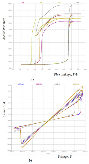 - Mladenov, V.; Kirilov, S. Advanced Memristor Model with a Modified Biolek Window and a Voltage-Dependent Variable Exponent. Inform. Autom. Pomiary Gospod. Ochr. Sr. (IAPGOŚ) 2018, 8, 15–20. Available online: https://e-iapgos.pl/resources/html/article/details?id=173606 (accessed on 16 December 2020).