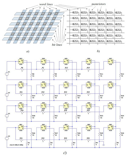 A schematic of a passive memristor memory crossbar [38] is presented in Figure 8a. Its electrical equivalent circuit is given in Figure 8b. These circuits are presented for further clarification of the memristor crossbar structure and operation in pulse mode. The memristor memory crossbar under analysis realized in LTSPICE is presented in Figure 8c. The corresponding netlist of the memory crossbar schematic is uploaded in the generated LTSPICE memristor library for additional information at https://github.com/mladenovvaleri/Advanced-Memristor-Modeling-in-LTSpise (accessed on 16 December 2020). The pulse voltage signals for writing, reading, and erasing information in the respective memory cells (the memristors) are applied between the corresponding selected memristor word line and the bit line. Owing to the very high resistance of the memristors in reverse, biasing the sneak path currents does not significantly affect the normal operation of the memory crossbar.