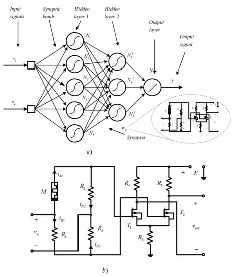 A simple feed-forward neural network for XOR (eXclusive OR) logical function emulation [39,40] is presented in Figure 10a for a description of its structure and operation. Supervised learning is applied for adjusting the synaptic weights. The synaptic bonds are based on memristors. The other elements of the neural network are based on CMOS technology. A detailed diagram of the applied memristor-based synapse is given in Figure 10b for explanation of its schematic and functioning principle. The input pulses are mixed with additive white Gaussian noise signals. The neural network has two inputs corresponding to the signals x1 and x2. It contains two hidden layers and an output layer. The neurons in the hidden layers are with tangent sigmoid activation functions while these in the output layer have linear activation functions. The first hidden layer contains five neurons and the second one has three neurons [35,39,40]. The output layer contains one neuron. The structure of the memristor-based synaptic circuit is presented in Figure 10b [41]. It contains a memristor element M and three resistors connected in a bridge topology and a differential amplifier for scaling the synaptic weights. The differential amplifier is based on two MOS transistors, T1 and T2, and three resistors, R4, R5, and R6. The considered transistors are of type Si4866DY. The transfer coefficient of the differential amplifier is denoted by kv.