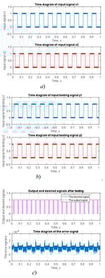 The time diagrams of the input signals x1 and x2 for training the neural network are presented in Figure 11a for visual expression of the logical signals. These signals correspond to logical zeros and ones for the emulation of XOR operation. The signals for testing the neural network are shown in Figure 11b. They are with a different sequence of the pulses according to the training input logical signals. The desired signal and the output signal after testing the neural net are presented in Figure 11c for confirmation of their good coincidence. The error signal is shown in the same figure for visual expression of its very low level. The amplitude of this signal is about one thousand times lower than the input logical signals’ levels. The decreasing of the mean square error during the training process is presented in Figure 11d for confirmation the proper operation of the neural network and the sufficient convergence of the training procedure.